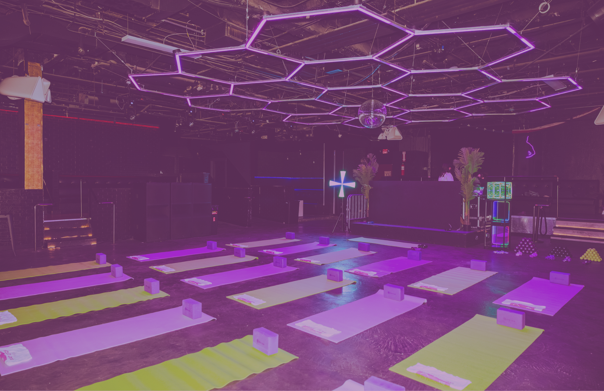 We’ve got you covered — literally. Our purple and green mats are waiting for you on the floor, glowing under the lights. But if you’ve got a favorite mat that feels like your dance partner, bring it along and make it part of the drop.